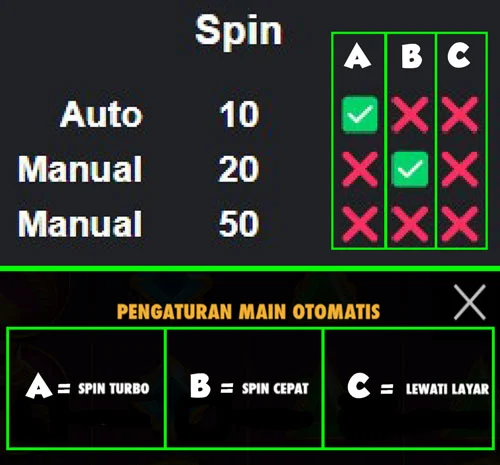 Perhatikan gambar di atas, 3 baris merupakan petunjuk dari Spin Turbo (A), Spin Cepat (B), dan Lewati Layar (C). Mari lihat contoh penggunaannya seperti gambar di bawah ini: